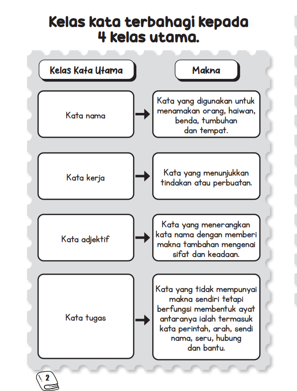 Buku Kelas Kata Utama merupakan buku aktiviti interaktif yang direka khusus untuk membantu murid memahami dan menguasai empat kelas kata utama dalam tatabahasa Bahasa Melayu, iaitu kata nama, kata kerja, kata adjektif, dan kata tugas.