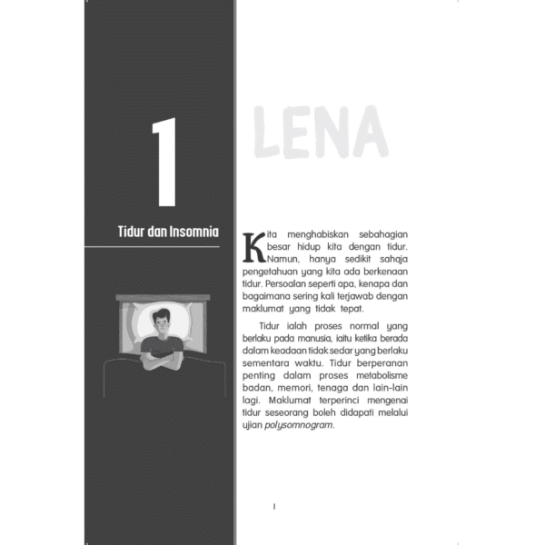 “LENA membawakan pembaca menyusuri dunia insomnia, gangguan tidur yang sering dipandang ringan, namun memberi kesan besar kepada kesihatan fizikal, mental dan emosi. Ditulis dalam gaya separa ilmiah oleh Tengku Mohd Saifuddin, buku ini menghuraikan punca-punca insomnia, kesannya terhadap kehidupan harian, serta pendekatan rawatan yang bersifat praktikal, berasaskan bukti dan mudah difahami. LENA bukan sekadar sebuah buku, tetapi teman buat mereka yang sedang mencari jalan untuk kembali lena dengan harapan, kefahaman, dan ilmu yang mendamaikan.”