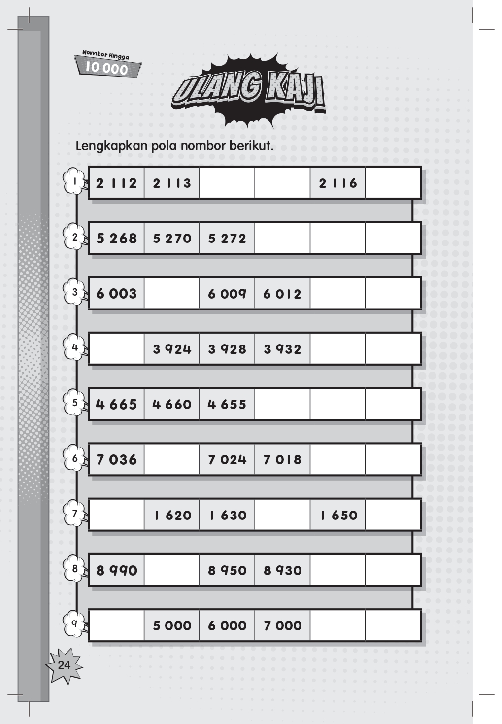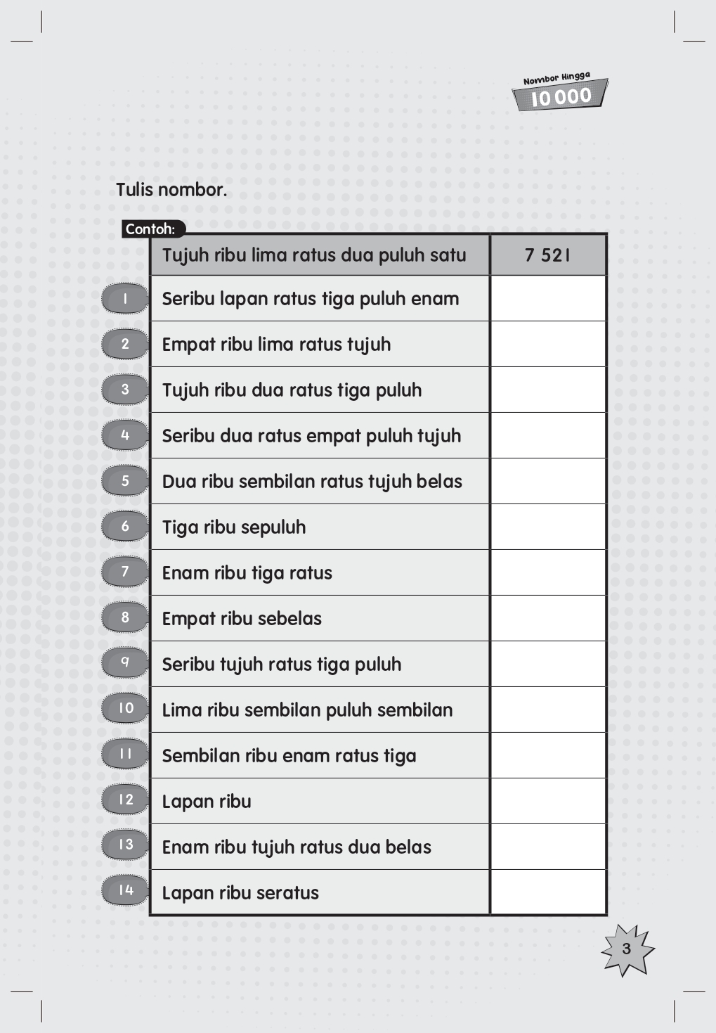 ‘Nombor Hingga 10 000 ialah buku latihan Matematik yang merangkumi soalan-soalan pemantapan awal murid Tahun 3. Kandungan topik yang disediakan merupakan asas yang mesti dikuasai murid sebelum mempelajari bab seterusnya seperti mengenal, menulis dan mengeja nombor hingga 10 000, cerakin mengikut nilai tempat atau nilai digit, membanding nombor lebih besar atau kecil, menganggar kuantiti objek, menyusun menaik atau menurun dan membundar nombor kepada puluh, ratus atau ribu terdekat.